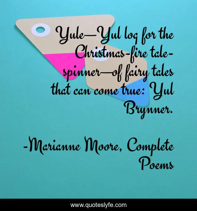 This page presents the quote "Yule—Yul log for the Christmas-fire tale-spinner—of fairy tales that can come true: Yul Brynner.". Author of this quote is Marianne Moore, Complete Poems. This quote is about yule, yul-brynner, christmas, yule-log,.