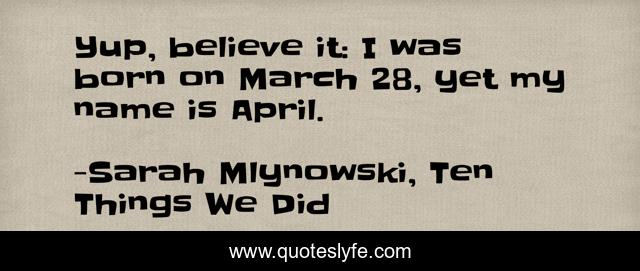 This page presents the quote "Yup, believe it: I was born on March 28, yet my name is April.". Author of this quote is Sarah Mlynowski, Ten Things We Did. This quote is about irony, metaphorical,.
