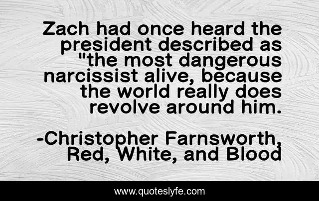 This page presents the quote "Zach had once heard the president described as "the most dangerous narcissist alive, because the world really does revolve around him.". Author of this quote is Christopher Farnsworth, Red, White, and Blood. This quote is about narcissism, president-s-vampire, vampire, nathaniel-cade, narcissist, president,.