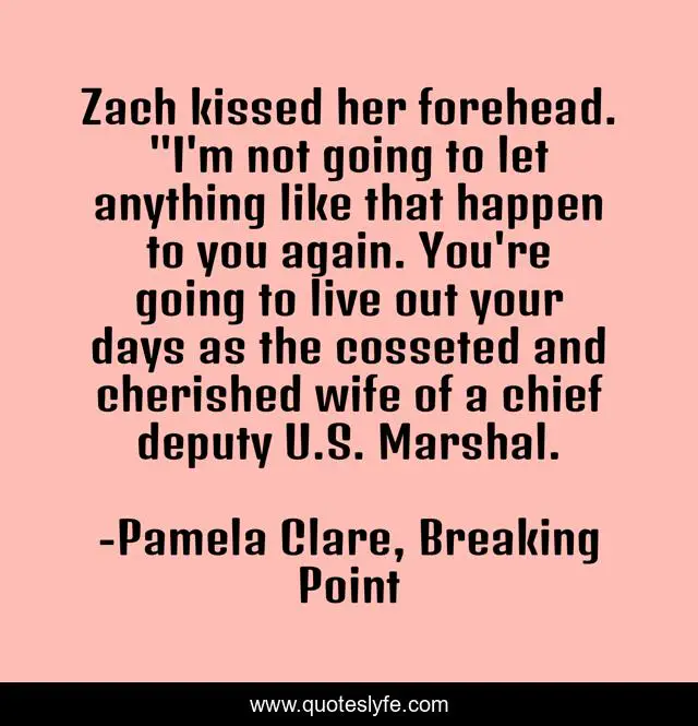 This page presents the quote "Zach kissed her forehead. "I'm not going to let anything like that happen to you again. You're going to live out your days as the cosseted and cherished wife of a chief deputy U.S. Marshal.". Author of this quote is Pamela Clare, Breaking Point. This quote is about happy-ending, romantic-suspense,.