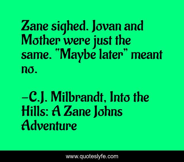 This page presents the quote "Zane sighed. Jovan and Mother were just the same. “Maybe later” meant no.". Author of this quote is C.J. Milbrandt, Into the Hills: A Zane Johns Adventure. This quote is about funny, mothers, cousins, friends, mothers-and-sons, early-readers, family-relationships, comedy, friendship,.