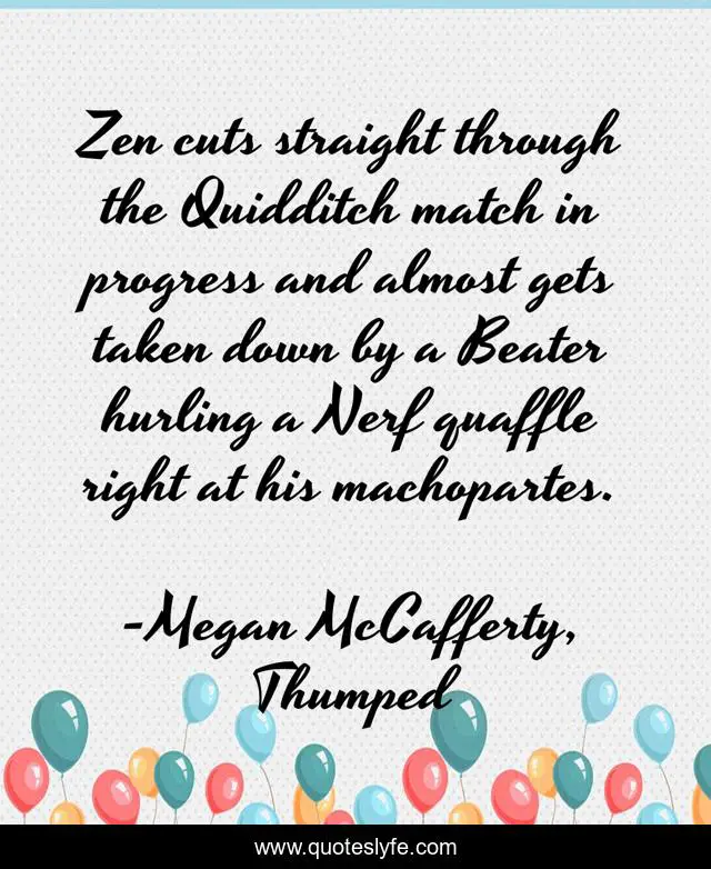 This page presents the quote "Zen cuts straight through the Quidditch match in progress and almost gets taken down by a Beater hurling a Nerf quaffle right at his machopartes.". Author of this quote is Megan McCafferty, Thumped. This quote is about funny, harry-potter-related, quidditch, comedy,.