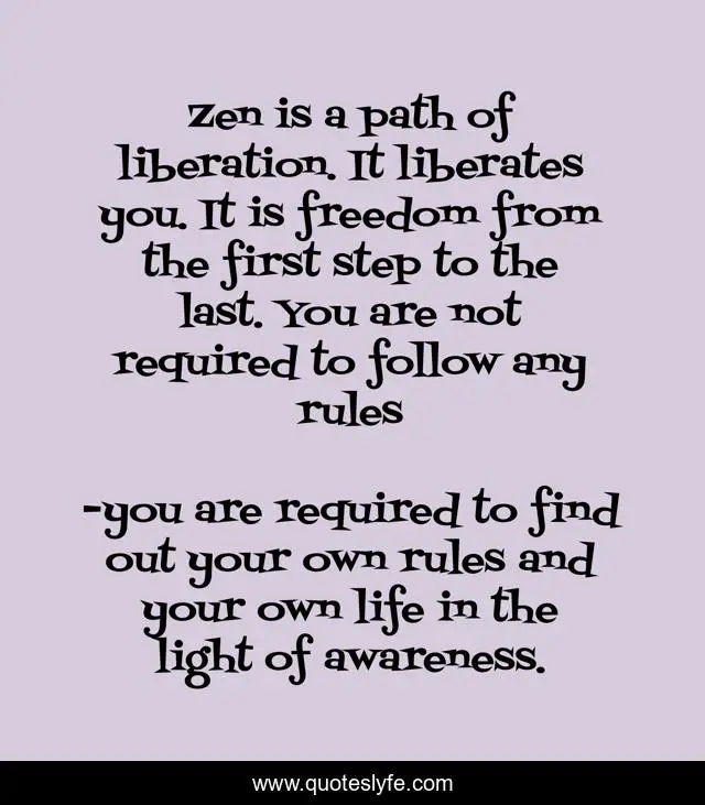 "you are required to find out your own rules and your own life in the light of awareness. Quotes." Quoteslyfe.com, 2025. Fri. 05 Dec. 2025. <https://www.quoteslyfe.com/quote/Zen-is-a-path-of-liberation-It-54800>.