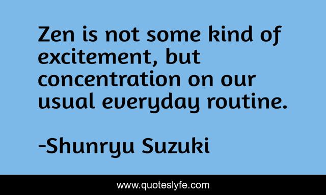 This page presents the quote "Zen is not some kind of excitement, but concentration on our usual everyday routine.". Author of this quote is Shunryu Suzuki. This quote is about enthusiasm, inspirational,.