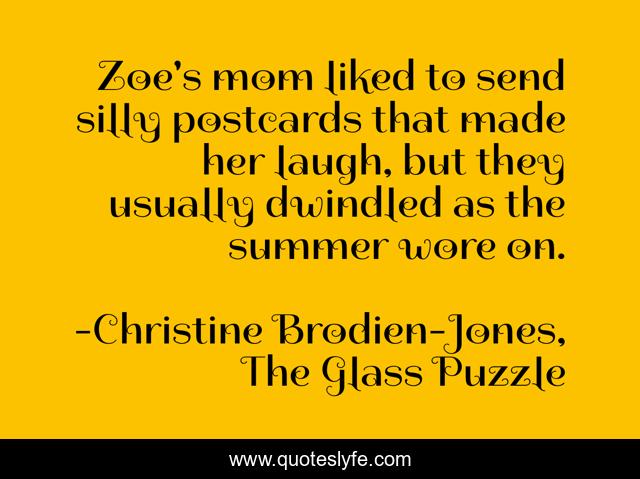 This page presents the quote "Zoe's mom liked to send silly postcards that made her laugh, but they usually dwindled as the summer wore on.". Author of this quote is Christine Brodien-Jones, The Glass Puzzle. This quote is about postcard, summer, silly,.