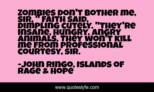 This page presents the quote "Zombies don't bother me, sir, " Faith said, dimpling cutely. "They're insane, hungry, angry animals. They won't kill me from professional courtesy, sir.". Author of this quote is John Ringo, Islands of Rage & Hope. This quote is about military-philosophy, zombies, zombie-apocalypse,.