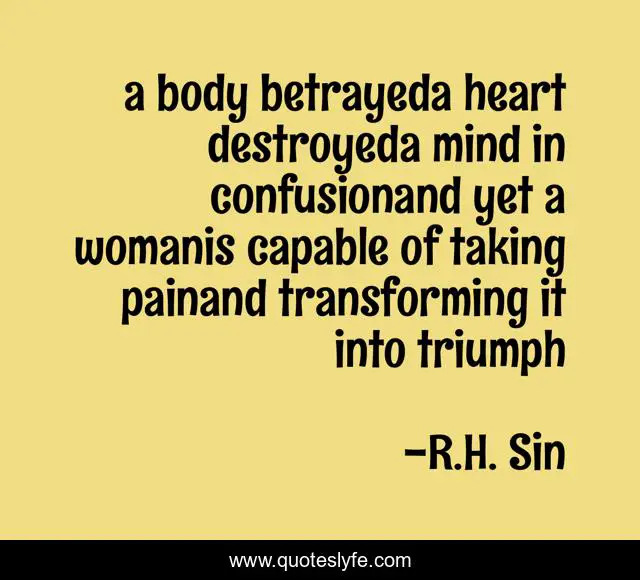 This page presents the quote "a body betrayeda heart destroyeda mind in confusionand yet a womanis capable of taking painand transforming it into triumph". Author of this quote is R.H. Sin. This quote is about life, woman, love, rh-sin, poetry, truth, r-h-sin, affection, women,.