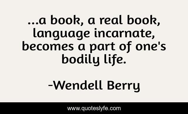 This page presents the quote "...a book, a real book, language incarnate, becomes a part of one's bodily life.". Author of this quote is Wendell Berry. .