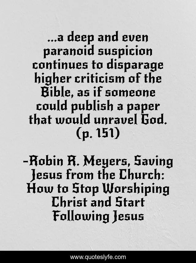 This page presents the quote "...a deep and even paranoid suspicion continues to disparage higher criticism of the Bible, as if someone could publish a paper that would unravel God. (p. 151)". Author of this quote is Robin R. Meyers, Saving Jesus from the Church: How to Stop Worshiping Christ and Start Following Jesus. This quote is about god, higher-criticism, bible,.