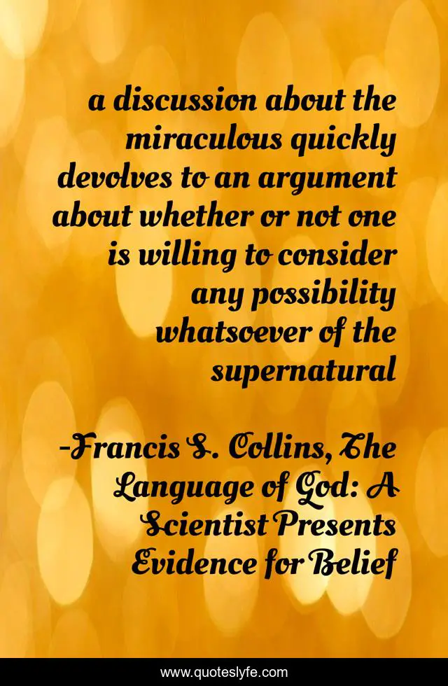This page presents the quote "a discussion about the miraculous quickly devolves to an argument about whether or not one is willing to consider any possibility whatsoever of the supernatural". Author of this quote is Francis S. Collins, The Language of God: A Scientist Presents Evidence for Belief. This quote is about miracles, science, creation,.