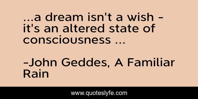 This page presents the quote "...a dream isn't a wish - it's an altered state of consciousness ...". Author of this quote is John Geddes, A Familiar Rain. This quote is about state-of-consciousnesssness, wishes, dreams,.