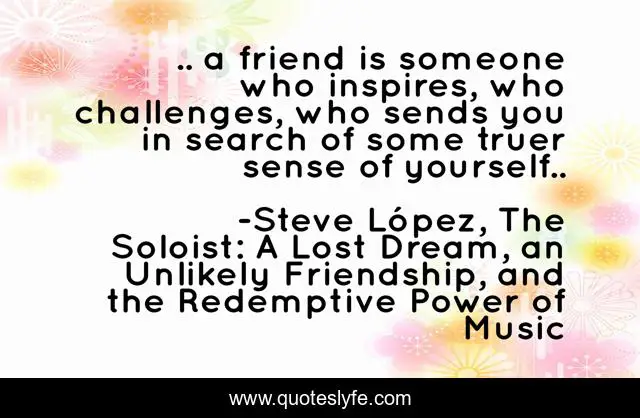 This page presents the quote ".. a friend is someone who inspires, who challenges, who sends you in search of some truer sense of yourself..". Author of this quote is Steve López, The Soloist: A Lost Dream, an Unlikely Friendship, and the Redemptive Power of Music. .