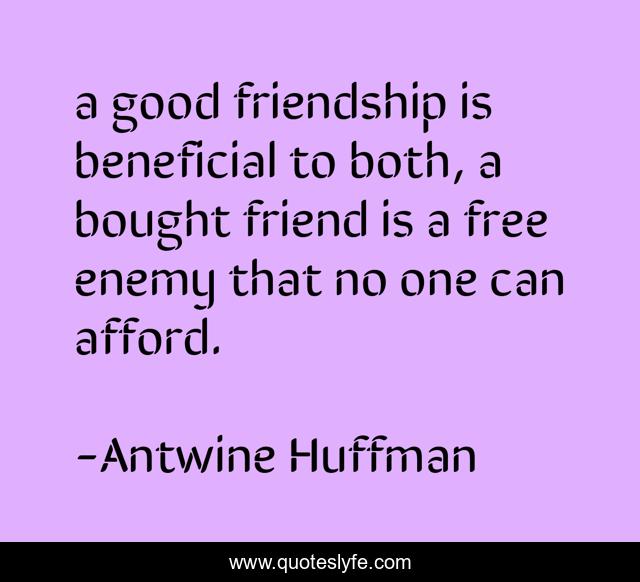 This page presents the quote "a good friendship is beneficial to both, a bought friend is a free enemy that no one can afford.". Author of this quote is Antwine Huffman. This quote is about friends, friendship, enemies,.