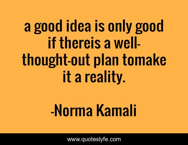 This page presents the quote "a good idea is only good if thereis a well-thought-out plan tomake it a reality.". Author of this quote is Norma Kamali. This quote is about plan, idea, reality,.
