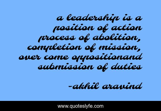 This page presents the quote "a leadership is a position of action process of abolition, completion of mission, over come oppositionand submission of duties". Author of this quote is akhil aravind. .