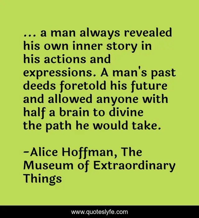 This page presents the quote "... a man always revealed his own inner story in his actions and expressions. A man's past deeds foretold his future and allowed anyone with half a brain to divine the path he would take.". Author of this quote is Alice Hoffman, The Museum of Extraordinary Things. This quote is about past, future,.