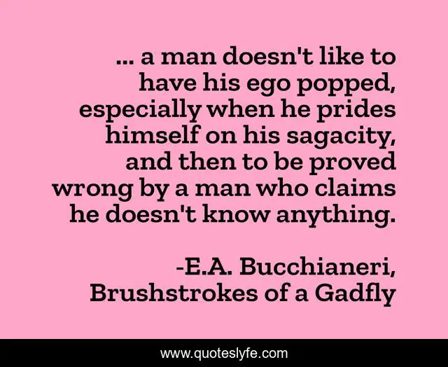 This page presents the quote "... a man doesn't like to have his ego popped, especially when he prides himself on his sagacity, and then to be proved wrong by a man who claims he doesn't know anything.". Author of this quote is E.A. Bucchianeri, Brushstrokes of a Gadfly. This quote is about funny, pride, egotist, humorous, sarcasm, irony, men, gadfly, black-humor,.