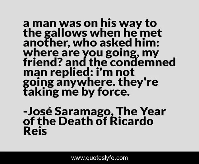 This page presents the quote "a man was on his way to the gallows when he met another, who asked him: where are you going, my friend? and the condemned man replied: i'm not going anywhere. they're taking me by force.". Author of this quote is José Saramago, The Year of the Death of Ricardo Reis. .