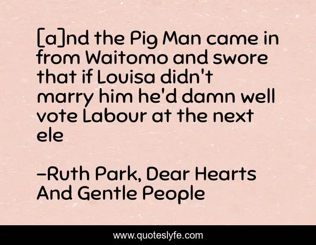 This page presents the quote "[a]nd the Pig Man came in from Waitomo and swore that if Louisa didn't marry him he'd damn well vote Labour at the next ele". Author of this quote is Ruth Park, Dear Hearts And Gentle People. This quote is about humor, stress, marriage, humour,.