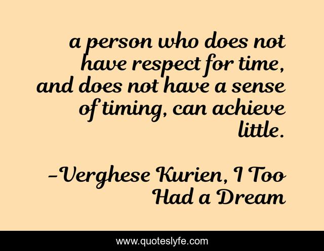 This page presents the quote "a person who does not have respect for time, and does not have a sense of timing, can achieve little.". Author of this quote is Verghese Kurien, I Too Had a Dream. This quote is about timing, achievement, time,.
