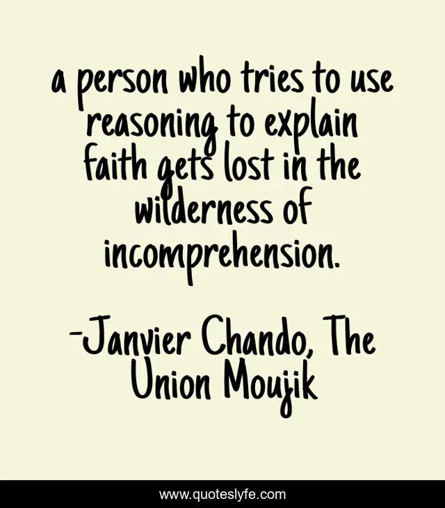This page presents the quote "a person who tries to use reasoning to explain faith gets lost in the wilderness of incomprehension.". Author of this quote is Janvier Chando, The Union Moujik. This quote is about love, family, optimistic, confidence, humor, positive, romance, spirituality, enthusiasm,.