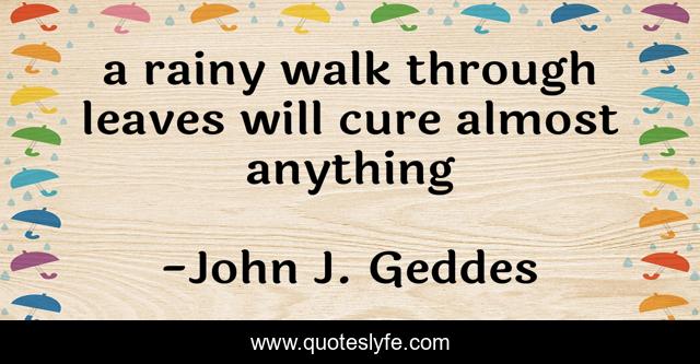 This page presents the quote "a rainy walk through leaves will cure almost anything". Author of this quote is John J. Geddes. This quote is about solitary, rain, walks,.