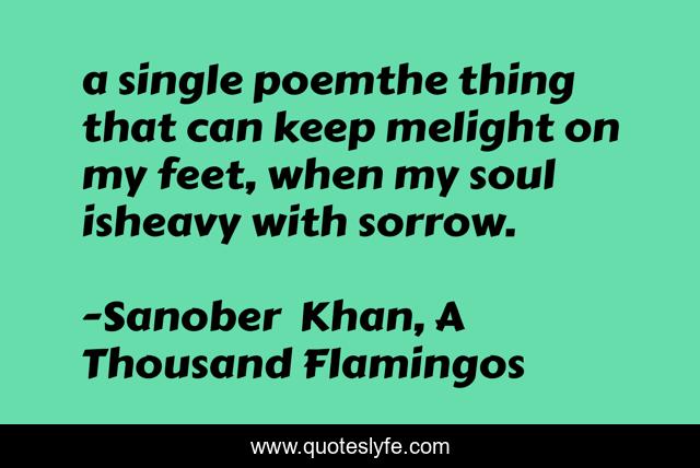 This page presents the quote "a single poemthe thing that can keep melight on my feet, when my soul isheavy with sorrow.". Author of this quote is Sanober Khan, A Thousand Flamingos. This quote is about poets-on-poetry, poets, indian-authors, sorrow, comfort, poetry-lovers, poetry, soothing, tumblr,.