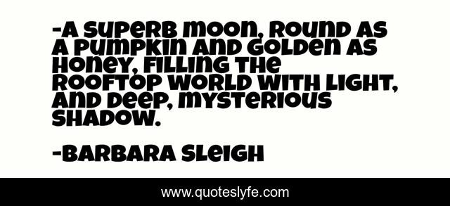 This page presents the quote "-a superb moon, round as a pumpkin and golden as honey, filling the rooftop world with light, and deep, mysterious shadow.". Author of this quote is Barbara Sleigh. This quote is about nature, calm, night,.