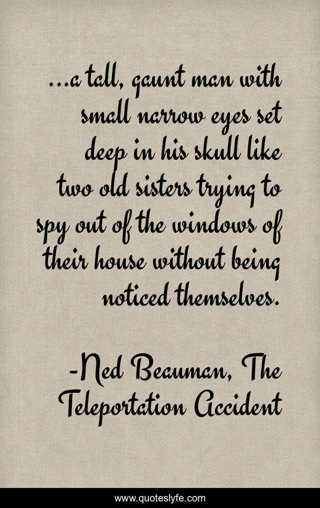 This page presents the quote "...a tall, gaunt man with small narrow eyes set deep in his skull like two old sisters trying to spy out of the windows of their house without being noticed themselves.". Author of this quote is Ned Beauman, The Teleportation Accident. .