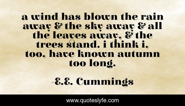 This page presents the quote "a wind has blown the rain away & the sky away & all the leaves away, & the trees stand. i think i, too, have known autumn too long.". Author of this quote is E.E. Cummings. This quote is about enthusiasm, inspirational,.