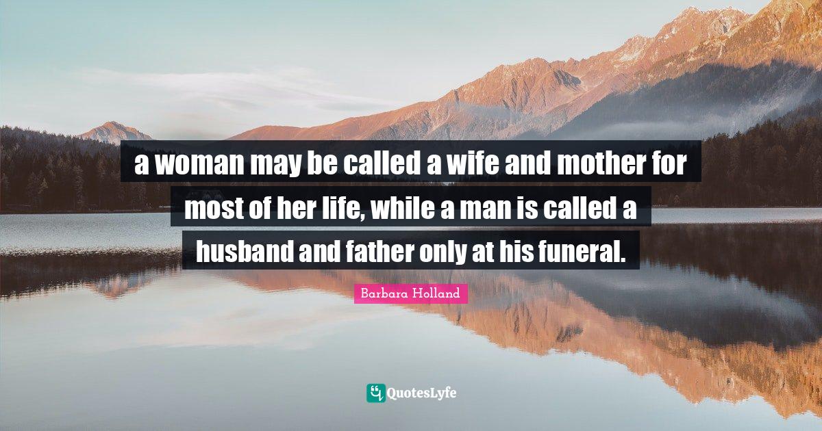 This page presents the quote "a woman may be called a wife and mother for most of her life, while a man is called a husband and father only at his funeral.". Author of this quote is Barbara Holland. This quote is about husband and father, mother, wife, life, may, father, husband, funeral,.