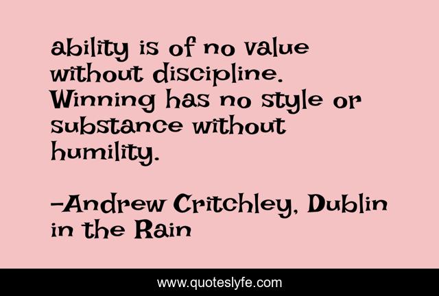 This page presents the quote "ability is of no value without discipline. Winning has no style or substance without humility.". Author of this quote is Andrew Critchley, Dublin in the Rain. This quote is about discipline, wining,.