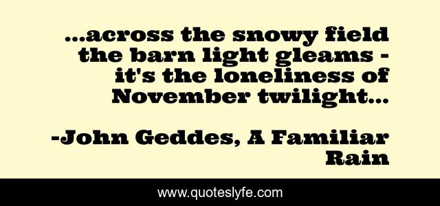 This page presents the quote "...across the snowy field the barn light gleams - it's the loneliness of November twilight...". Author of this quote is John Geddes, A Familiar Rain. This quote is about nature, loneliness, poetry, field, barn-light, twilight,.