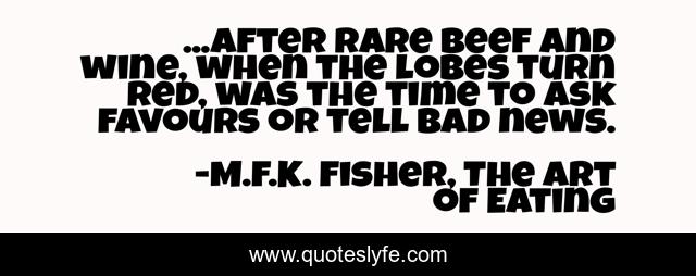 This page presents the quote "...after rare beef and wine, when the lobes turn red, was the time to ask favours or tell bad news.". Author of this quote is M.F.K. Fisher, The Art of Eating. This quote is about food, advice,.