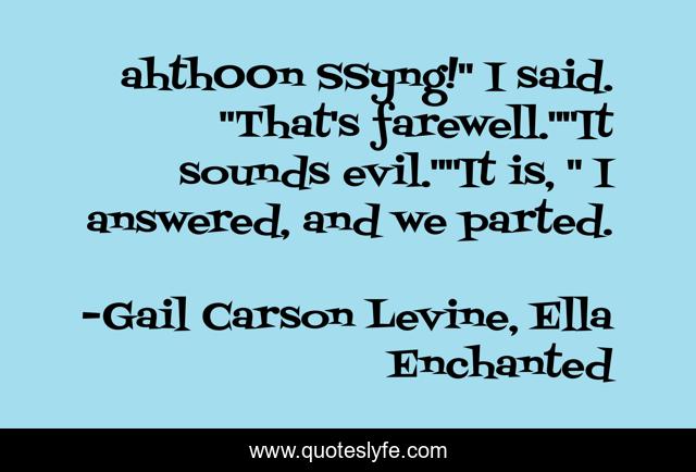 This page presents the quote "ahthOOn SSyng!" I said. "That's farewell.""It sounds evil.""It is, " I answered, and we parted.". Author of this quote is Gail Carson Levine, Ella Enchanted. This quote is about love, goodbye, language, farewells, words, affection,.