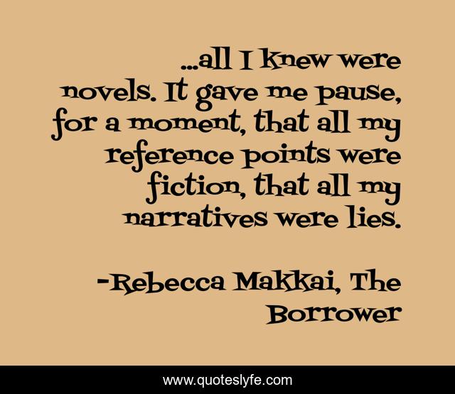 This page presents the quote "...all I knew were novels. It gave me pause, for a moment, that all my reference points were fiction, that all my narratives were lies.". Author of this quote is Rebecca Makkai, The Borrower. This quote is about on-fiction, fiction,.