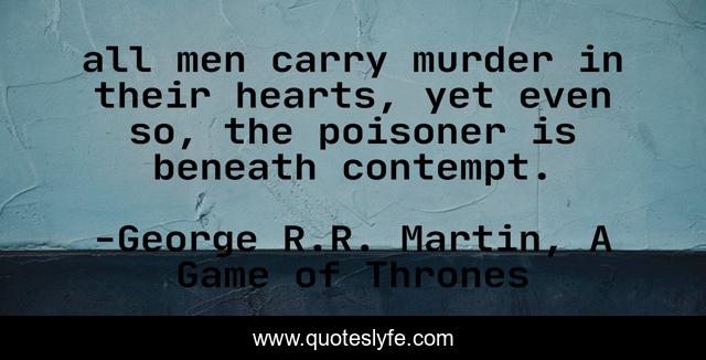 This page presents the quote "all men carry murder in their hearts, yet even so, the poisoner is beneath contempt.". Author of this quote is George R.R. Martin, A Game of Thrones. This quote is about murder, contempt, poison,.