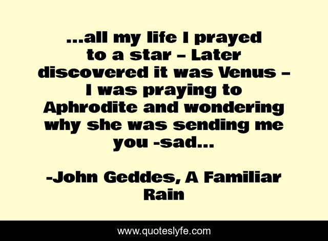 This page presents the quote "...all my life I prayed to a star – Later discovered it was Venus – I was praying to Aphrodite and wondering why she was sending me you -sad...". Author of this quote is John Geddes, A Familiar Rain. This quote is about disillusioned, love, poetry, affection, prayer,.
