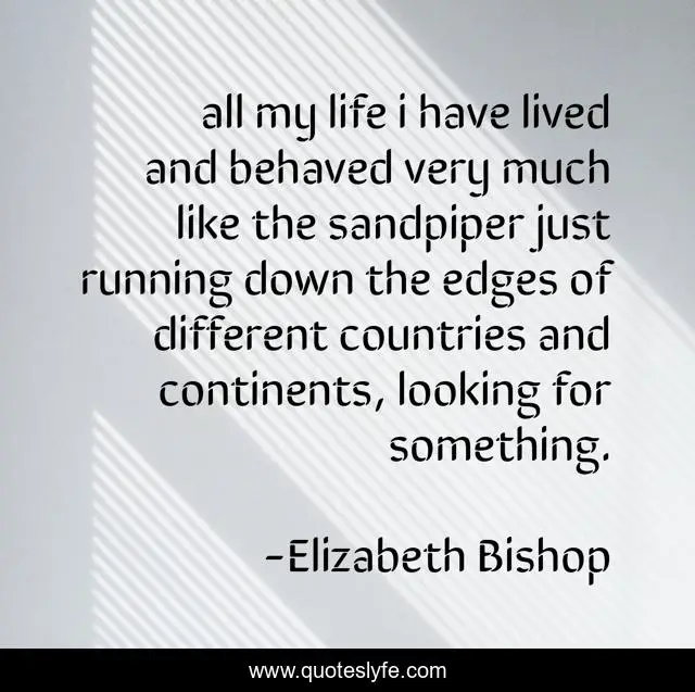 This page presents the quote "all my life i have lived and behaved very much like the sandpiper just running down the edges of different countries and continents, looking for something.". Author of this quote is Elizabeth Bishop. This quote is about wanderlust, ocean,.