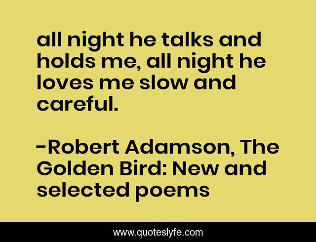 This page presents the quote "all night he talks and holds me, all night he loves me slow and careful.". Author of this quote is Robert Adamson, The Golden Bird: New and selected poems. .
