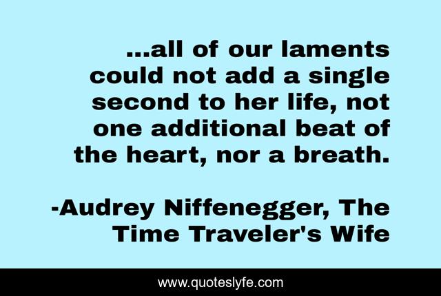 This page presents the quote "...all of our laments could not add a single second to her life, not one additional beat of the heart, nor a breath.". Author of this quote is Audrey Niffenegger, The Time Traveler's Wife. This quote is about loss, death,.