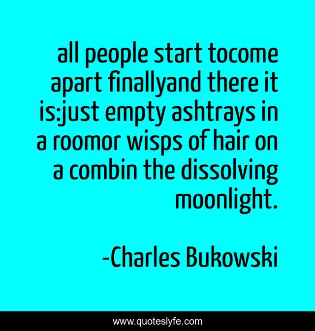 This page presents the quote "all people start tocome apart finallyand there it is:just empty ashtrays in a roomor wisps of hair on a combin the dissolving moonlight.". Author of this quote is Charles Bukowski. This quote is about fire, quote, through-the-looking-glass, through, charles-bukowski, poems, quotesfire,.