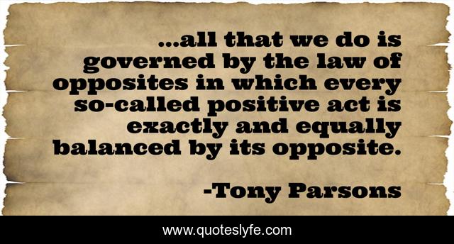 This page presents the quote "...all that we do is governed by the law of opposites in which every so-called positive act is exactly and equally balanced by its opposite.". Author of this quote is Tony Parsons. This quote is about duality, yin-yang, non-duality, spirituality, opposites, tao,.
