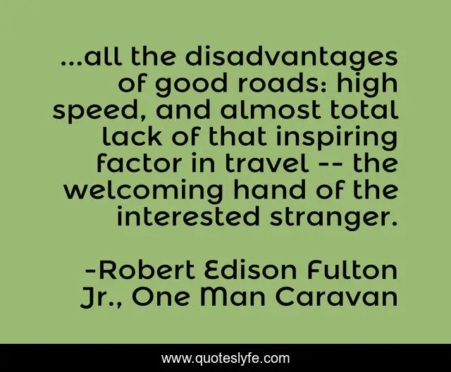 This page presents the quote "...all the disadvantages of good roads: high speed, and almost total lack of that inspiring factor in travel -- the welcoming hand of the interested stranger.". Author of this quote is Robert Edison Fulton Jr., One Man Caravan. This quote is about roads, strangers, travel, traveling, good-roads,.