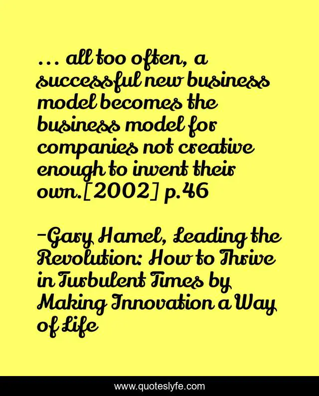 This page presents the quote "... all too often, a successful new business model becomes the business model for companies not creative enough to invent their own.[2002] p.46". Author of this quote is Gary Hamel, Leading the Revolution: How to Thrive in Turbulent Times by Making Innovation a Way of Life. This quote is about creativity, business, strategy,.