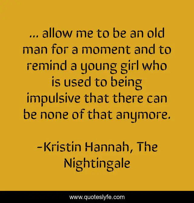 This page presents the quote "... allow me to be an old man for a moment and to remind a young girl who is used to being impulsive that there can be none of that anymore.". Author of this quote is Kristin Hannah, The Nightingale. This quote is about none, old-man, impulsive, remind, moment, young-girl,.