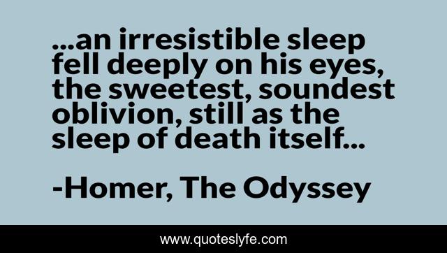 This page presents the quote "...an irresistible sleep fell deeply on his eyes, the sweetest, soundest oblivion, still as the sleep of death itself...". Author of this quote is Homer, The Odyssey. .