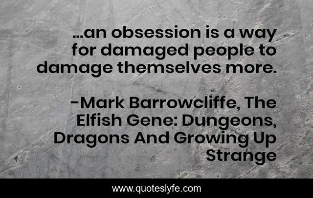 This page presents the quote "...an obsession is a way for damaged people to damage themselves more.". Author of this quote is Mark Barrowcliffe, The Elfish Gene: Dungeons, Dragons And Growing Up Strange. This quote is about damaged, obsession,.