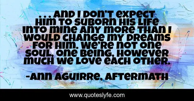 This page presents the quote ". . . and I don’t expect him to suborn his life into mine any more than I would change my dreams for him. We’re not one soul, one being, however much we love each other.". Author of this quote is Ann Aguirre, Aftermath. This quote is about soul, dreams,.