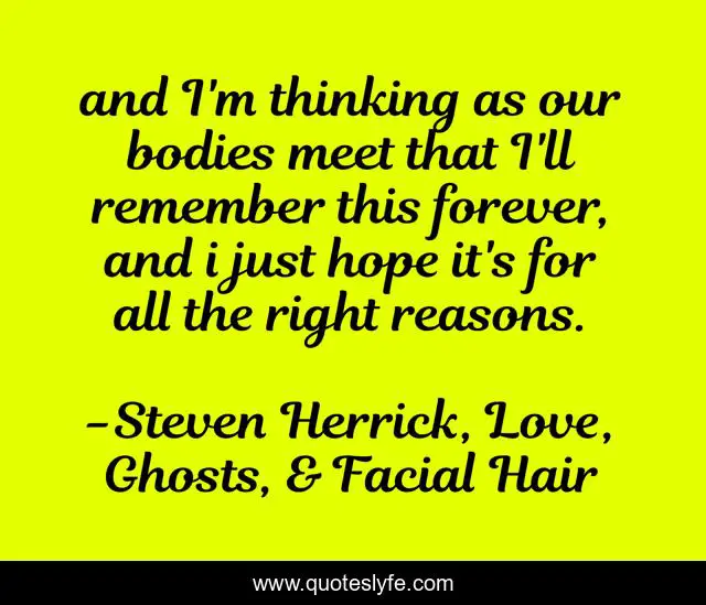 This page presents the quote "and I'm thinking as our bodies meet that I'll remember this forever, and i just hope it's for all the right reasons.". Author of this quote is Steven Herrick, Love, Ghosts, & Facial Hair. This quote is about memories, love, affection,.